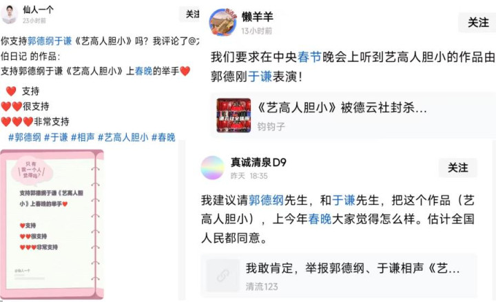 更有意思的是,网上有一部分郭德纲粉丝通过发布小作文等方式,呼吁有关部门让郭德纲相声《艺高人胆小》登上央视春晚舞台,给全国观众欣赏。